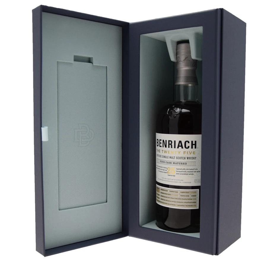 Benriach The Twenty Five est un Single Malt riche et somptueux né de l’association de quatre fûts de whiskies tourbés et non tourbés : Sherry, Bourbon, fûts de chêne neufs et de Madère.