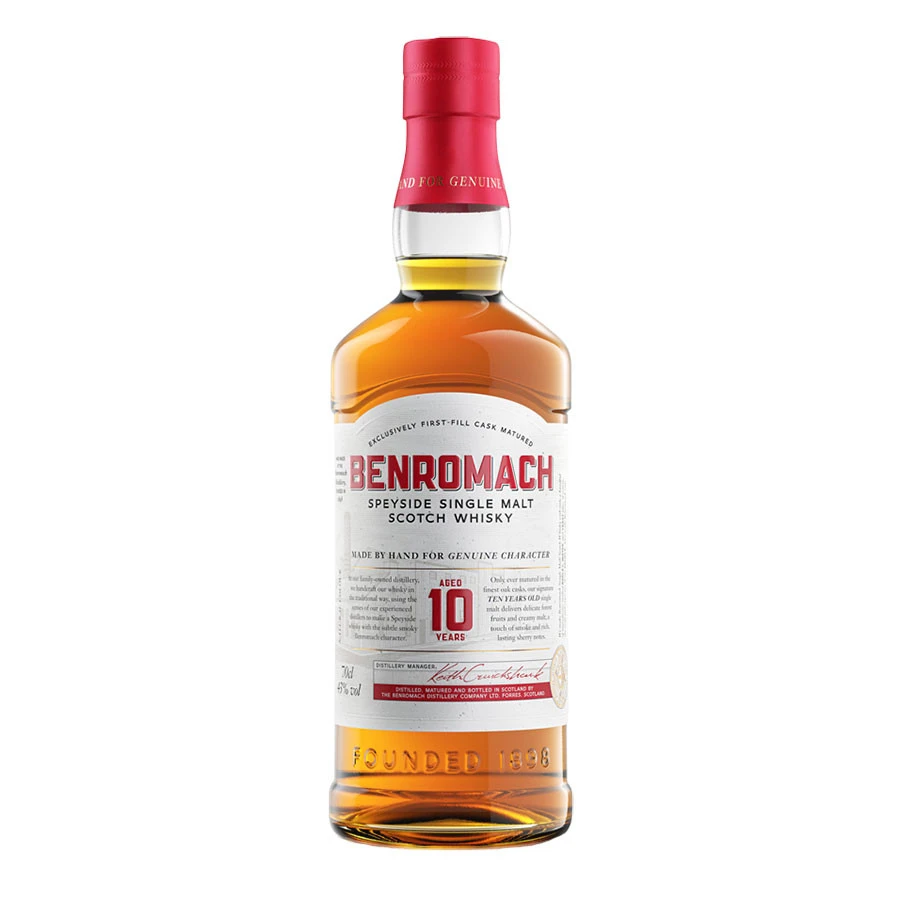 Benromach 10 ans est un whisky réalisé à partir d’une eau de source des collines de Romach dans la région du Speyside en Écosse. Les notes fumées qu’on retrouve dans ce Single Malt est un signe distinctif de la distillerie Benromach.