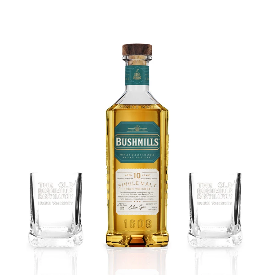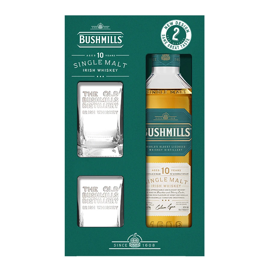 Bushmills 10 ans est présenté dans son coffret dégustation accompagné de deux verres à whiskey, à découvrir entre amateurs ou connaisseurs du fameux Single Malt irlandais.