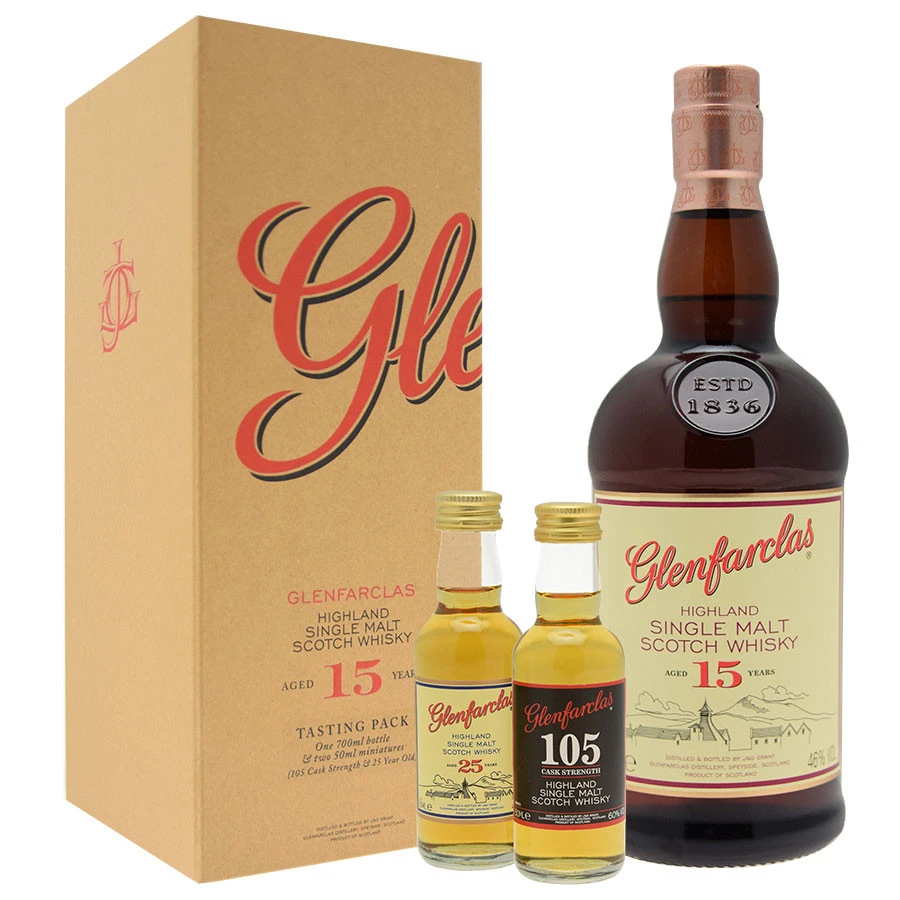 Coffret découverte Glenfarclas 15 ans accompagné du Glenfarclas 105 et 25 ans en version mignonnettes de 5cl !