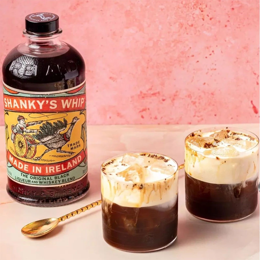 Cette bouteille à l’effigie du célèbre jockey irlandais Shanky et de son fouet (« whip ») contient une liqueur élaborée à base de Black Whiskey irlandais, d’une liqueur irlandaise, de vanille naturelle et d’arômes de caramel.