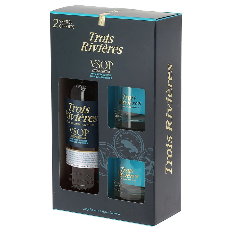 Parfait pour offrir, ce coffret renferme un embouteillage du Rhum Trois Rivières VSOP Réserve Spéciale ainsi que deux verres de dégustation.